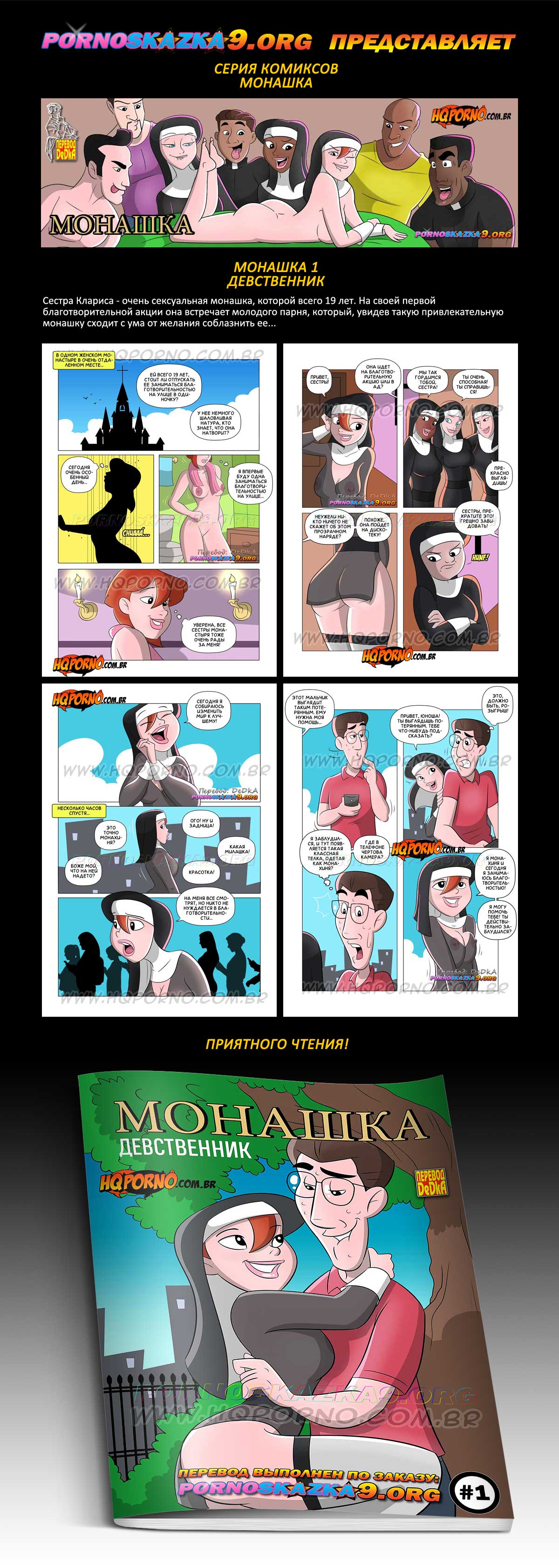 Порно комикс «Монашка. Часть 1. Девственник.» Сестра Клариса — очень сексуальная монашка, которой всего 19 лет. На своей первой благотворительной акции она встречает молодого парня, который, увидев такую привлекательную монашку сходит с ума от желания соблазнить ее…